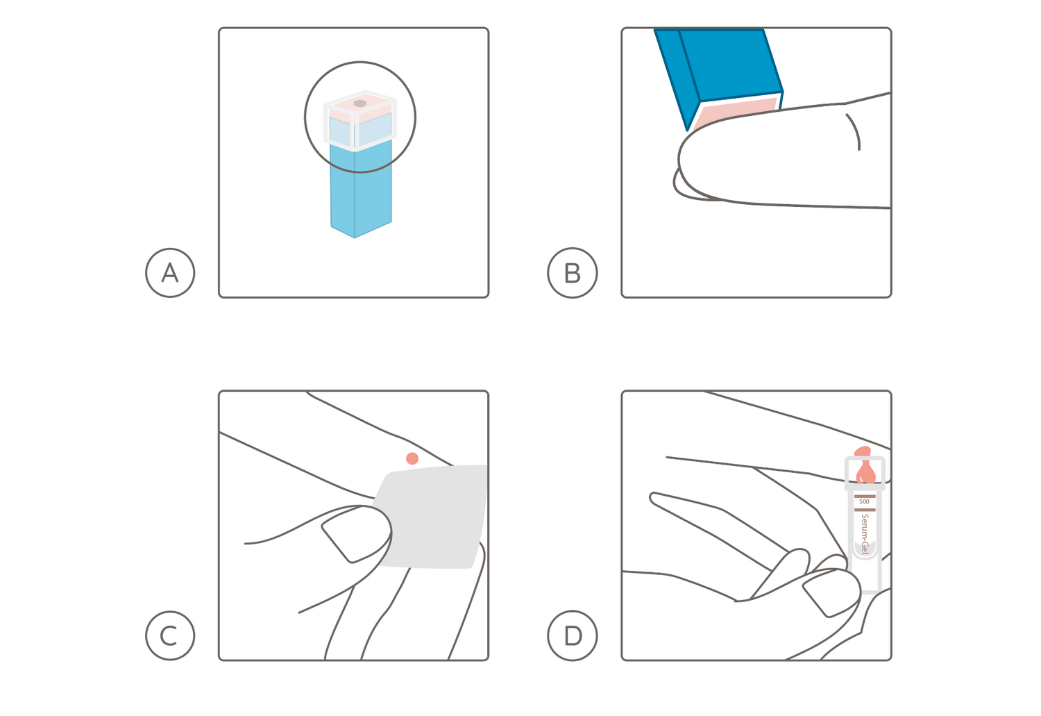 D. Die nächsten Blutstropfen lassen Sie von links nach rechts auf die ersten beiden Kreise der Protein Saver Card tropfen. Die Kreise sollten gut und über den Rand hinaus gefüllt sein. Durch Massieren des Fingers vom Ansatz in Richtung Fingerkuppe können Sie die Bildung von Blutstropfen unterstützen. Bitte vermeiden Sie starkes Quetschen des Fingers, da das Testergebnis verfälscht werden könnte. Wenn es zu keiner ausreichenden Tropfenbildung (Blutung) kommt, sollte die zweite Lanzette an einer anderen Stelle verwendet werden. Die Einstichstelle wischen Sie mit dem zweiten Alkoholtupfer ab. Anschließend kleben Sie das Pflaster auf die Punktionsstelle.