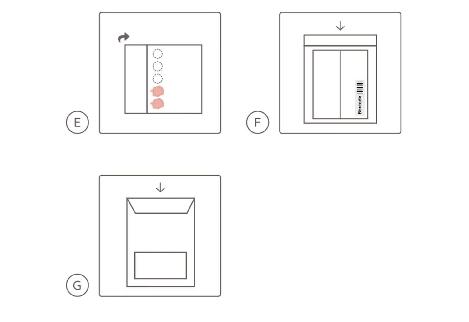 G. Zum Versand geben Sie das Druckverschlussbeutel mit der Protein Saver Card mit dem ausgedruckten Probenbegleitschein in die beiliegende Versandtasche. Senden Sie diese umgehend an unser Labor zurück. Wie Sie den Probenbegleitschein erstellen, erfahren Sie auf unserer Website „dr-petersohn.com/tests“.
