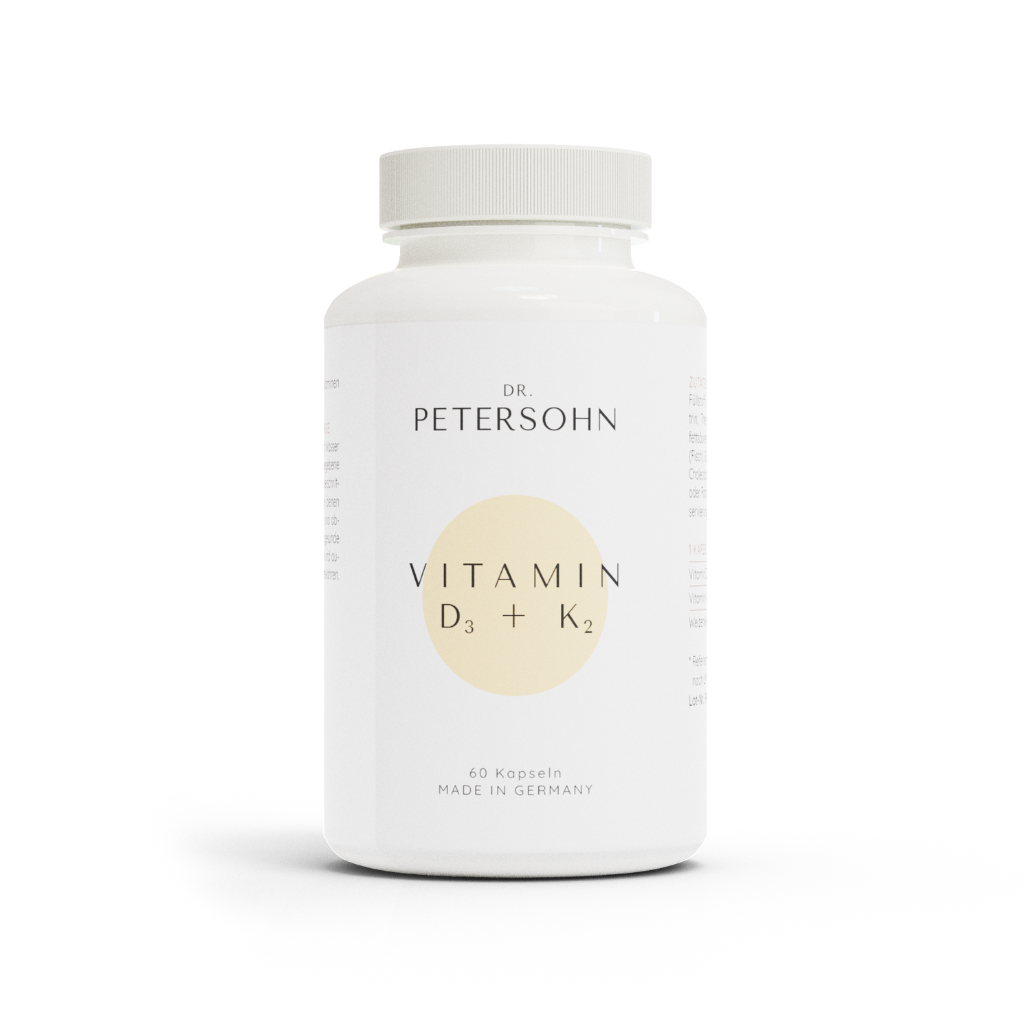 Die Sonne ist die Energiequelle, um die sich alles dreht. Neben dem wohligen Gefühl, wenn Sonnenstrahlen auf die menschliche Haut treffen, passiert aus medizinischer Sicht weitaus mehr Gutes: Der Körper produziert durch Eigensynthese das lebenswichtige Vitamin D. Jedoch nur, wenn die Sonne im exakt richtigen Winkel steht und der UV-B-Index den benötigten Wert erreicht. In deutschen Breitengraden ist eine ausreichende Sonnenexposition nahezu unmöglich. Nahrungsergänzungsmittel können den Vitamin-D-Gehalt im Blut verbessern. Vor mehr als 25 Jahren wurde unser Vitamin D₃ + K₂ in Eigenregie von Dr. Petersohn in Zusammenarbeit mit renommierten Ärzten und einem Biologen entwickelt. Nicht nur, um dem in Deutschland weit verbreiteten Vitamin-D-Mangel entgegenzuwirken. Sondern auch um ein ärztlich fundiertes und biologisch naturreines Präparat zu innovieren und etablieren. Bis heute wird unser Nahrungsergänzungsmittel stetig weiterentwickelt, kontinuierlich überprüft und nach neuesten Erkenntnissen optimiert. Dabei unterscheidet besonders die fundierte ärztliche Expertise von Dr. Petersohn unser Vitamin D₃ + K₂ von anderen Präparaten.